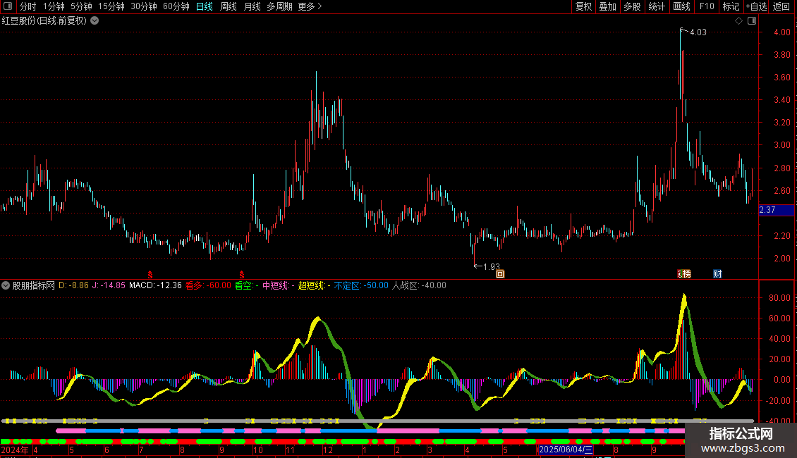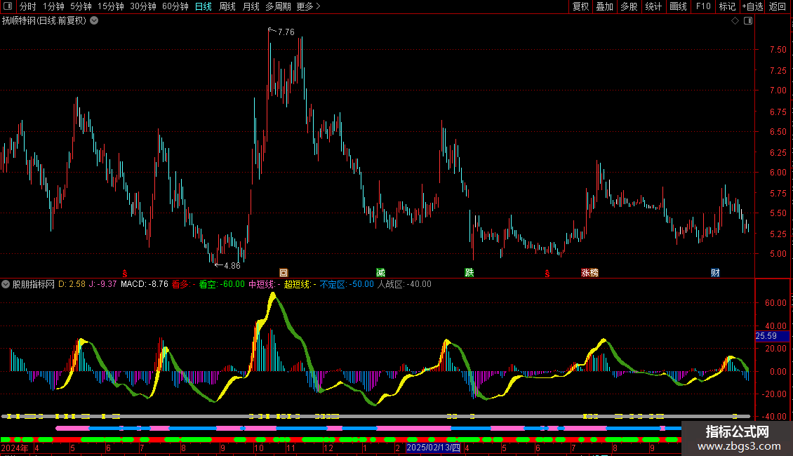 中短线:IF(J>D,-50,DRAWNULL),LINETHICK7,COLORCC66FF;