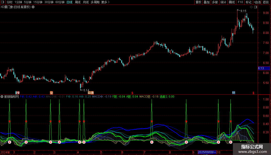 A中:EMA(F中,9),COLORLICYAN,LINETHICK1;