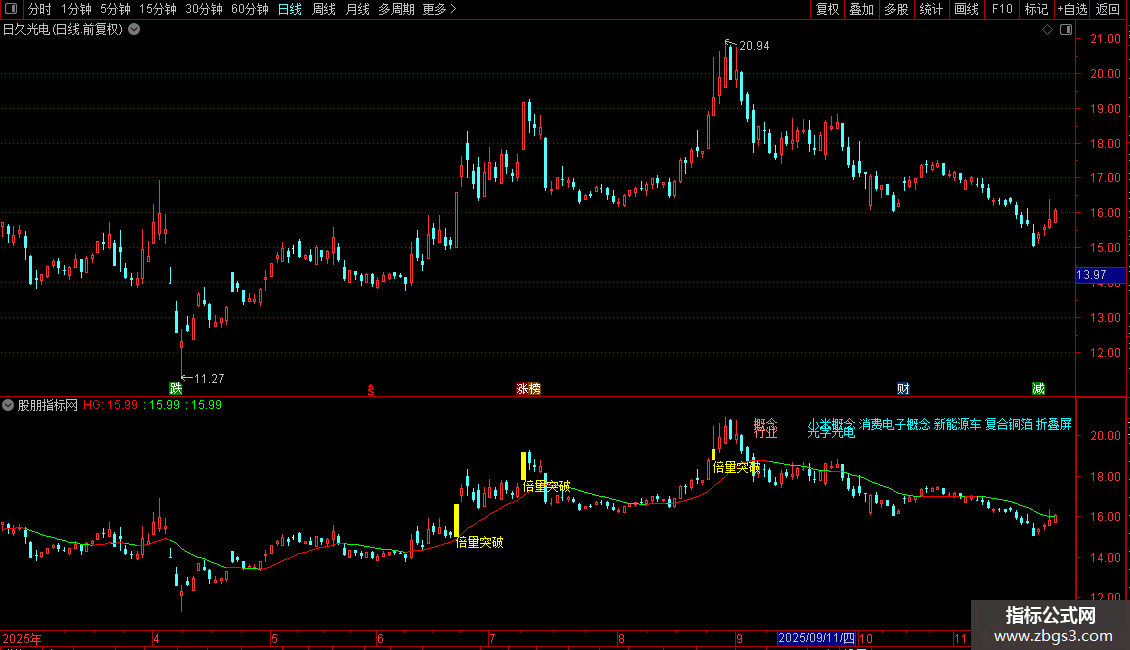 指标通过识别历史高点位置,结合成交量异动和价格突破行为,在K线图上标记买入信号点,并显示行业概念信息辅助决策。