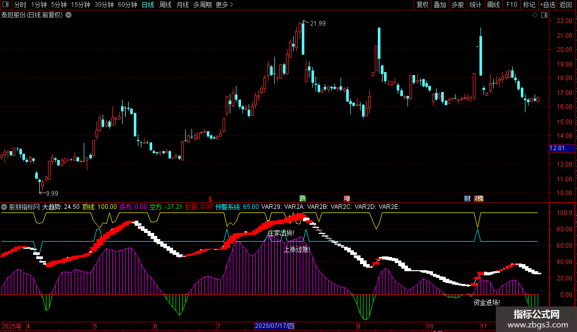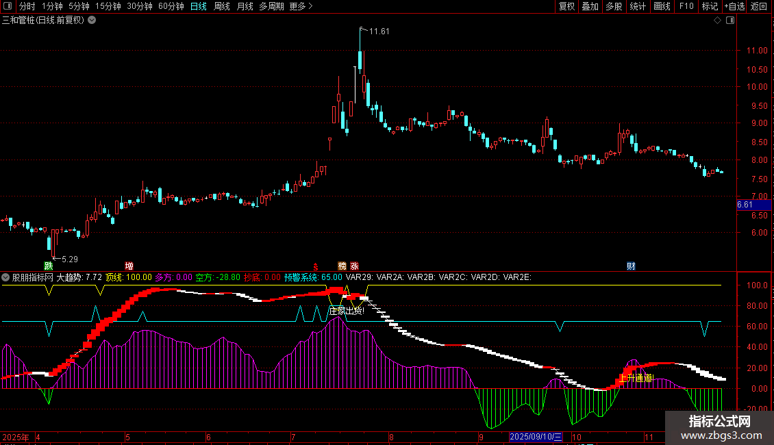 VAR23:=多方>60 AND 预警系统>65 AND 顶线=100;