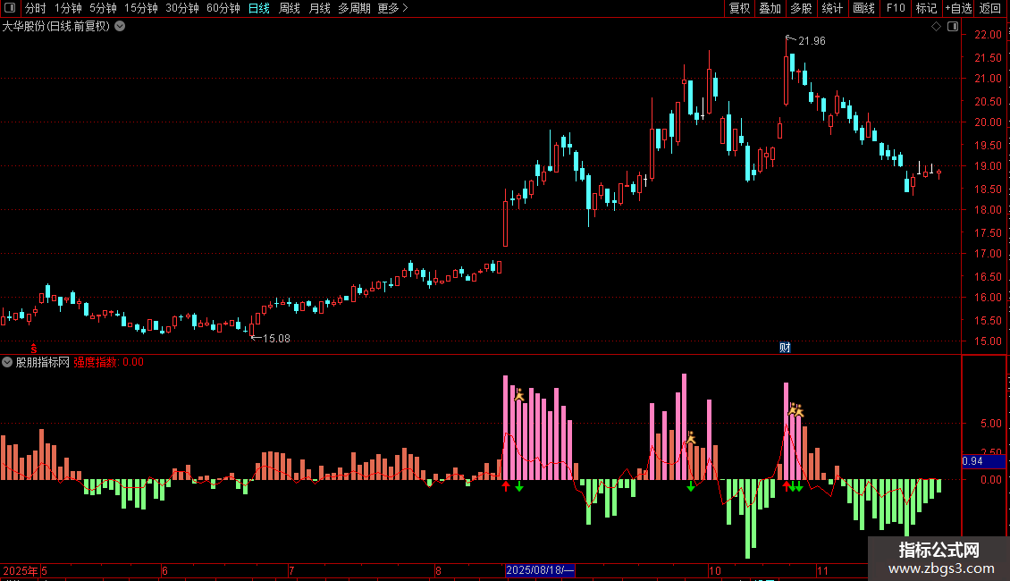 指标通过计算价格与成交量的多维度关系,结合超买超卖判断和强度变化识别交易机会。主要功能是监控价格偏离均线的程度、量价配合状态以及市场强度变化,用彩色柱状图和图标直观显示买卖信号。