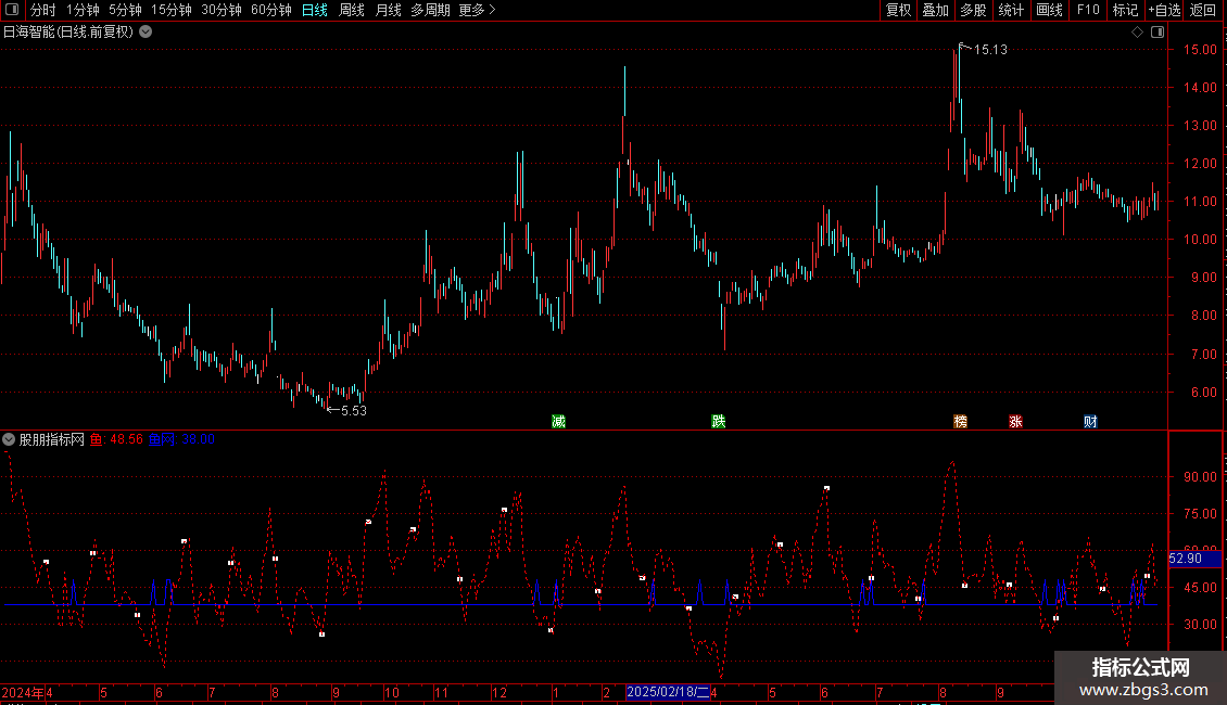 鱼网:IF((CROSS(RSI2,RSI4) OR CROSS(RSI2,A3) AND A3<好线 AND RSI1<平线),48,38),COLORBLUE,LINETHICK1;
