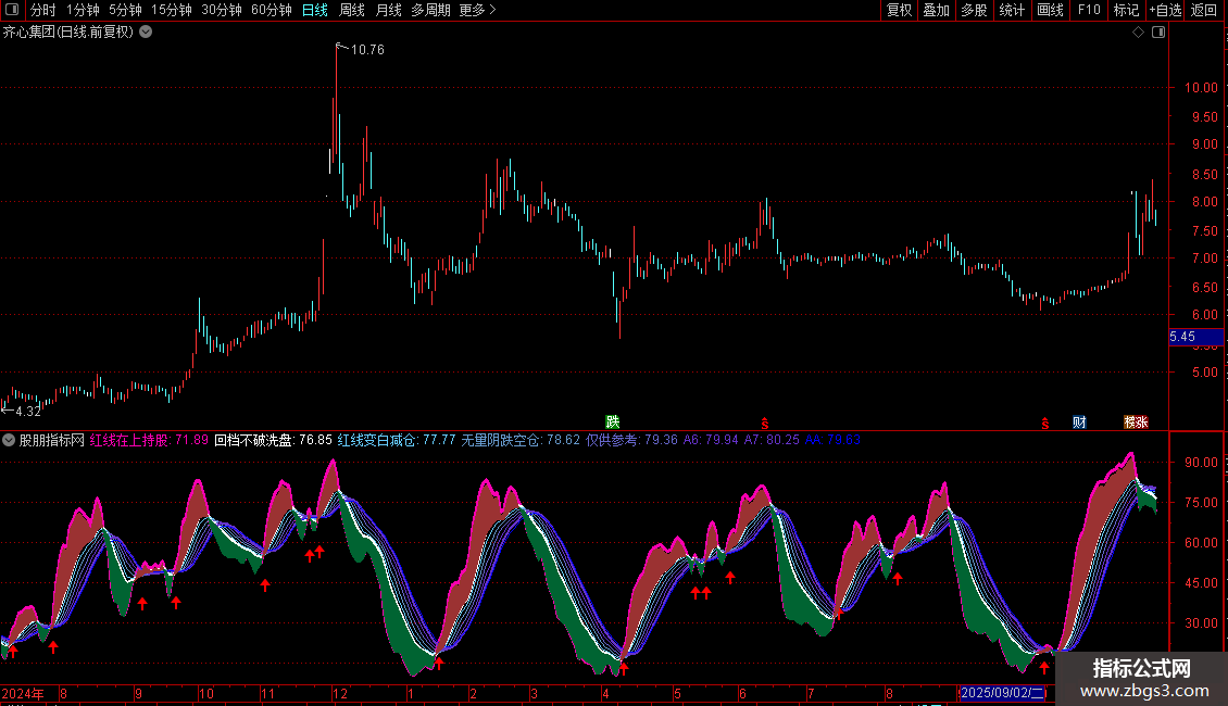 当满足条件红线在上持股上穿A7时,在(红线在上持股*0.80)位置画1号图标