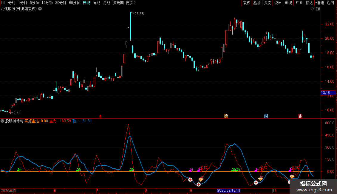 当满足条件主力上穿散户AND主力<-10时,在主力位置画23号图标