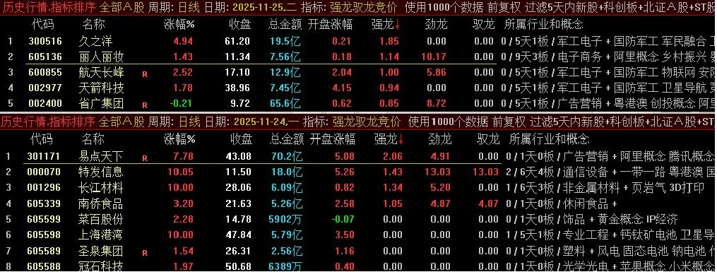 在电脑上用,交易日9:25后~9:30之前,快捷键 .401将排序指标更改为“强龙驭龙竞价”,系统自动刷新数据,排序有三个信号,一个是“强龙”,一个是“劲龙”,一个是“驭龙”,三个信号中,都是做一进二的参考,如果一个票同时具备这三个信号,三个信号都有数据,那么这样的票当天是可以重点关注的,作为一进二的重中之重。