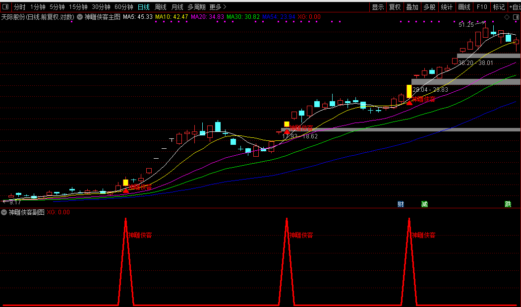 当满足所有条件时,在K线图上显示黄色实体,并在低位显示"神雕侠客"文字标识,同时用红色箭头明确标记买入点位置。