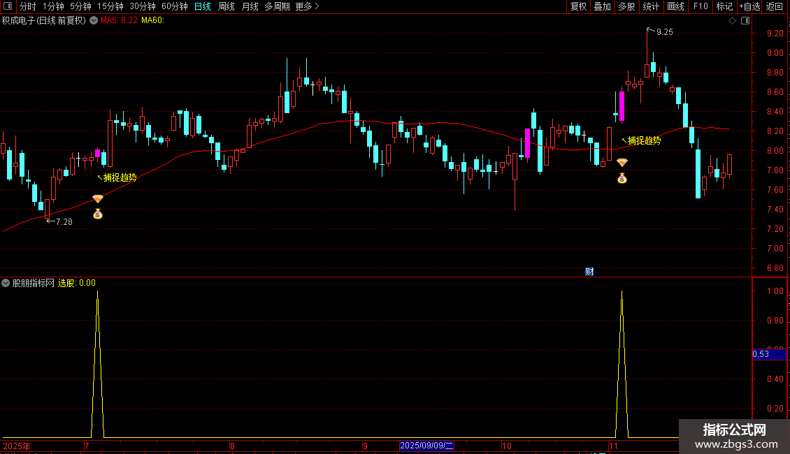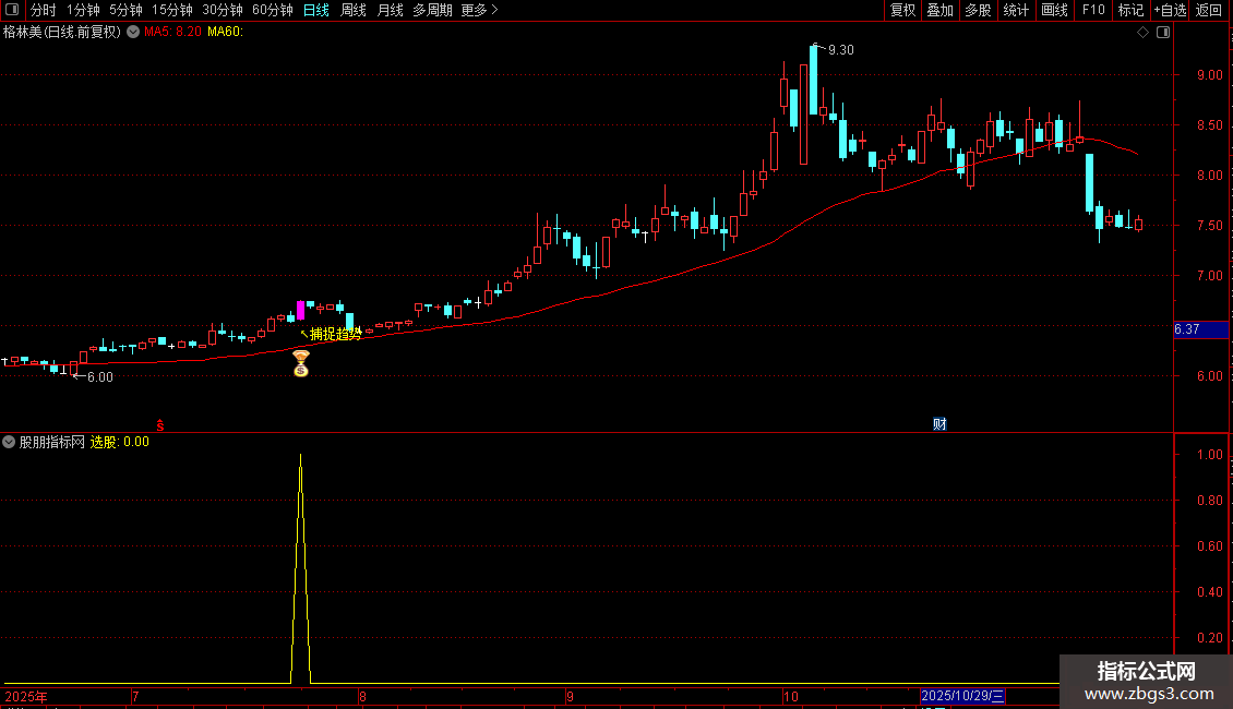 选股:VAR1 AND 捕捉线>REF(捕捉线,1) AND C>捕捉线,COLORYELLOW;
