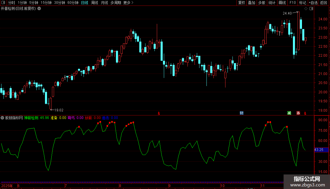 逢高派发: STICKLINE(神箭检测>80,神箭检测+1,神箭检测-1,1.5,0), COLORRED;
