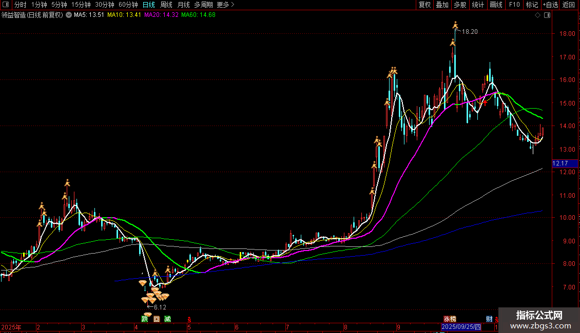 DRAWICON((MA(C,4)*4+MA(C,25))/5>=MA(C,25) AND MA(C,5)<MA(C,25),L*0.97,1);