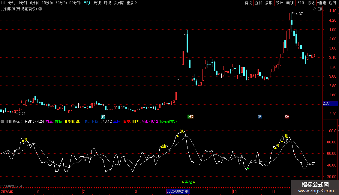 当满足条件ISLASTBARANDRSI1<1日前的RSI1时,在VM位置书写文字,COLORCCEE00