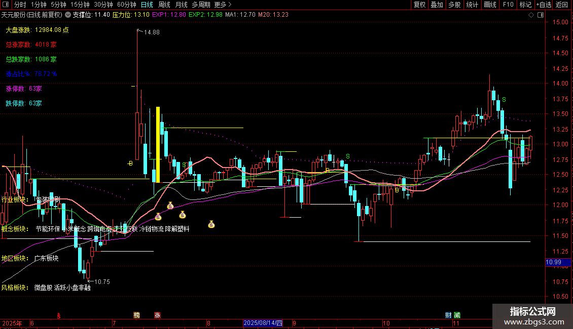 包含:大盘涨跌指数、行业概念、地区风格,支撑压力 钱袋 BS买卖,80%筹码