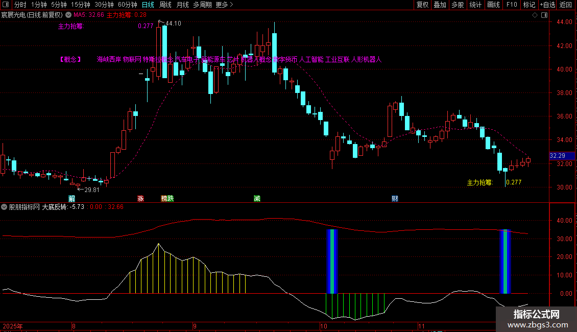1.副图出现蓝色量能柱加上底部反转信号代表股价大底出现。