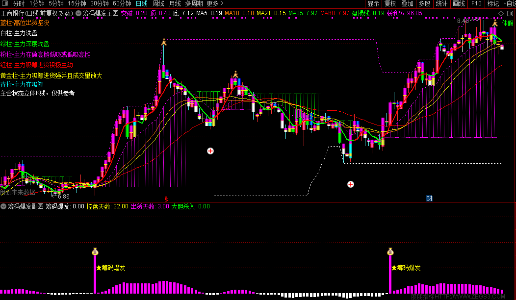 筹码爆发是通达信平台专业追踪主力资金动向的精品指标,独创"控盘度+筹码分布+趋势验证"三维分析体系。通过双重EMA算法精准计算主力控盘程度,实时显示白色(无庄)、红色(有庄)、绿色(出货)、粉色(高度控盘)四种状态,让庄家轨迹无处遁形。