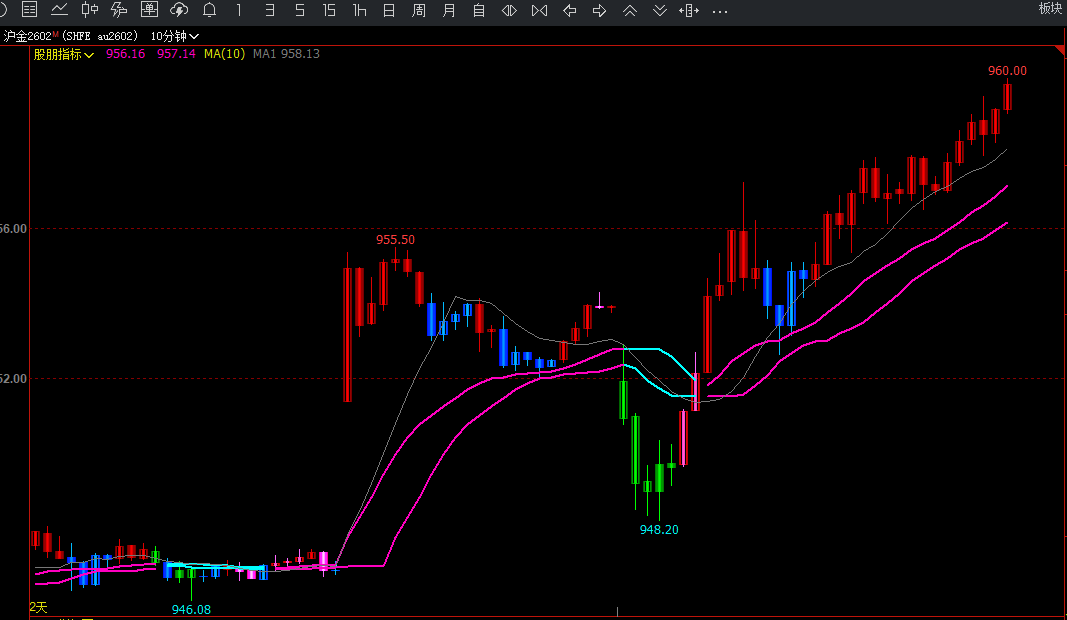 “双龙出海趋势跟踪系统”是文华财经平台上的一款高效技术指标,通过多重移动平均线组合与动态K线着色,直观揭示趋势强弱与转折点。该指标以3日、6日和21日均线为核心,结合价格行为,将市场状态分为四大场景:当短期均线上行且长期趋势向上时,K线以红色系显示多头强势;短期均线下行但长期趋势向上时,以蓝色系标识调整机会;长期趋势向下时,则以绿色和粉色系警示风险。此外,系统辅以EMA通道线(如20日EMA的极值点),动态标注支撑与压力区域,帮助投资者快速识别趋势延续或反转信号。
