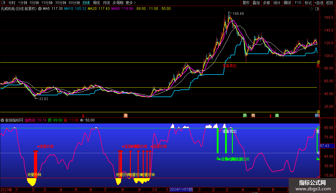 指标通过计算股价在长期周期中的相对位置形成趋势线,结合动态价格区间识别地量反转机会。当趋势线从极低区域向上突破且价格低于地量反转线时产生买入信号;当趋势线进入极高区域且价格高于地量反转线时发出卖出警示。策略分准备与执行两阶段:准备阶段提示潜在机会,执行阶段在趋势确认时操作。