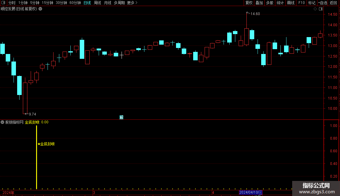 操作策略:当系统出现"金底封喉"黄色信号柱时,表明股票可能结束长期下跌,开始强势反弹,是较为明确的买入时机。