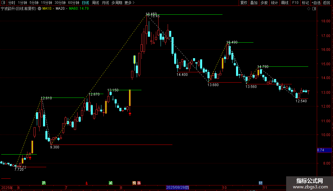 趋势向上:DRAWLINE(UU,L,NN,H,0),COLORYELLOW,DOTLINE;
