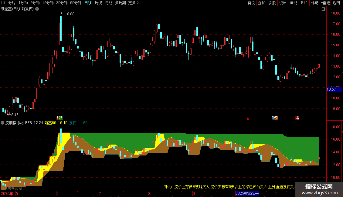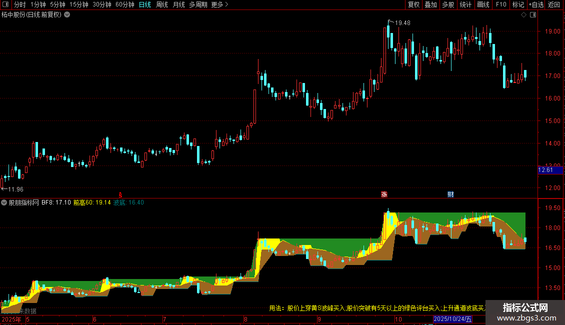 DRAWTEXT_FIX(1,0.5,0.9,0,'用法:股价上穿黄s波峰买入;股价突破有5天以上的绿色评台买入;上升通道波底买入'),COLORYELLOW;