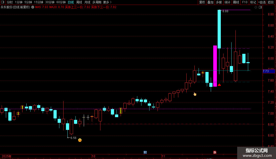 实体下三一价:MIN(OPEN,CLOSE)+ABS(OPEN-CLOSE)/3,NODRAW,COLORRED;
