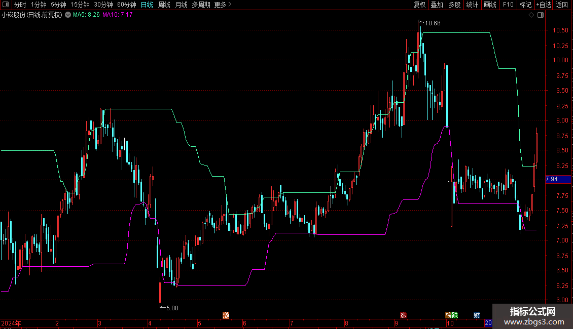 支撑:MA(REF(LLV(上收,30),1),2),COLORMAGENTA,LINETHICK1;