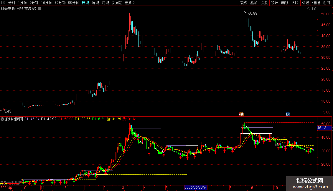 只有经过长期实践和在牛、熊市中经得起时间考验的指标才是好指标,该指标通过“趋和势”两条线的走势和其它线段及买卖提示的辅助,可以成功率极高的抓到启动初期大牛股。公式简单实用,配合成交量一起使用会起到事半功倍的效果。慢慢揣摩,必有收获;如果突破E1,并且回踩不破,将有一波主升行情。 如果突破C1,并且回踩不破,一波主升行情已经展开。