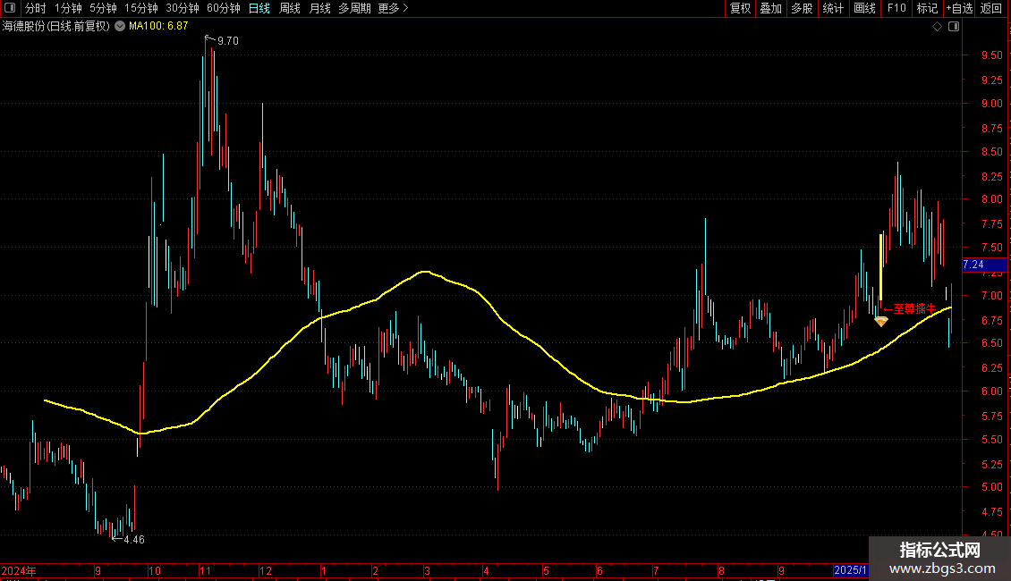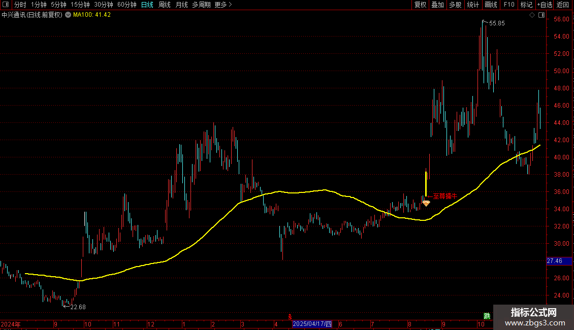 1 至尊擒牛指标以均线理论为基础 核心均线MA100在主图中显示为黄色线 作为市场趋势风向标 是判断长期走势的重要依据