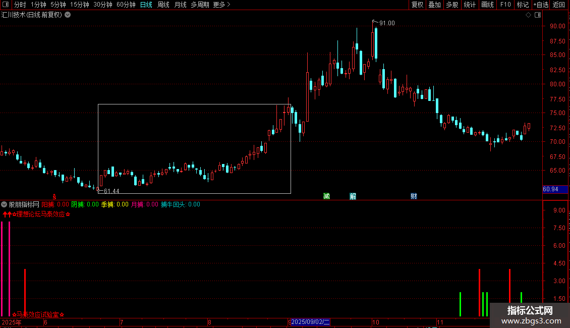 捕牛回头:VAR2<(HHV(VAR2,60))/7 AND C<MA60 AND REF(MA60,1)<=REF(C,1),COLORLIBLUE,NODRAW;DRAWTEXT_FIX(1,0.02,0,0,'☆理想论坛马泰效应☆'),COLORRED;DRAWTEXT_FIX(1,0.02,5,0,'☆马泰效应试验室☆'),COLORRED;