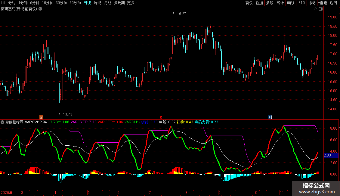 计算短期波动(VARGY)和长期趋势(筹码大局),并用颜色区分上升和下降趋势。