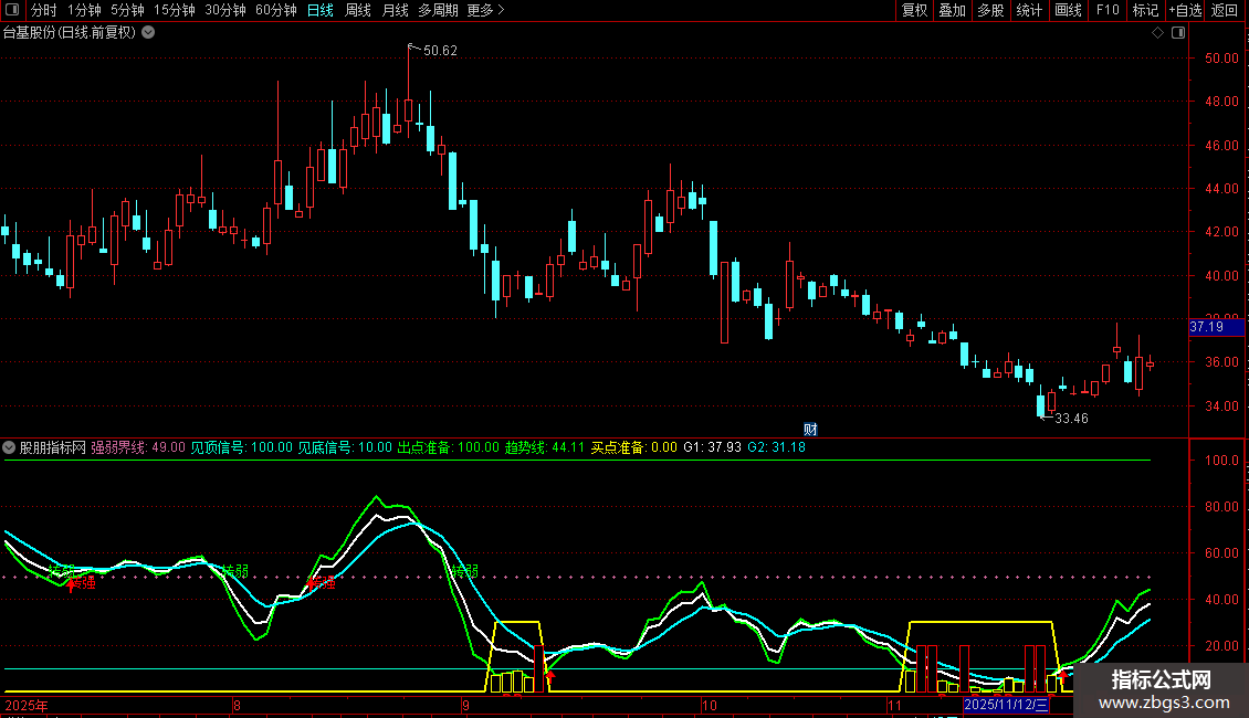 DRAWTEXT(CROSS(49,趋势线),52,'转弱'),COLORGREEN;