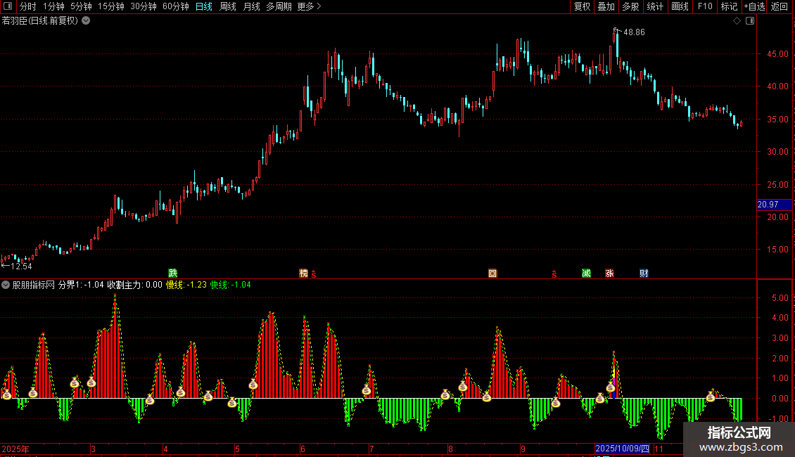 STICKLINE(分界1< 0,分界1,0,2,0),COLORGREEN;