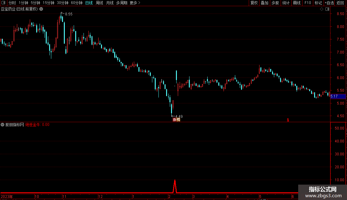 绝世金牛:IF((A AND B AND D AND 避开刀尖 AND COUNT(A AND B AND D,20)=1),10,0),COLORRED,LINETHICK3;