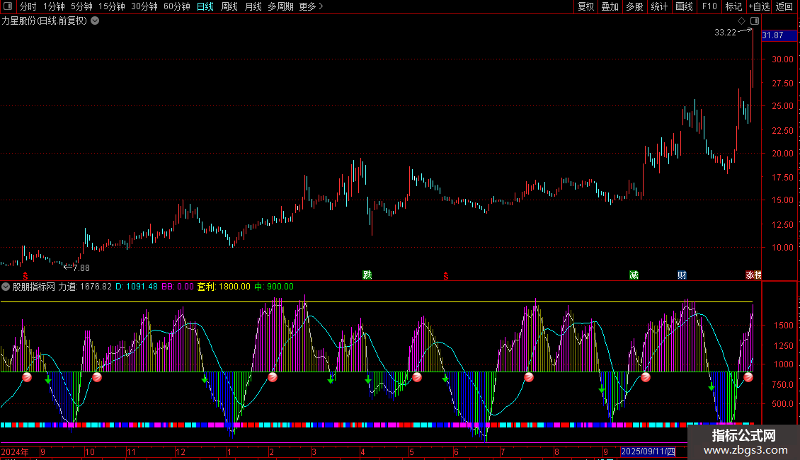 - 买入信号:出现黄色「买股」标记+红色量化信号+力道线上穿中轴