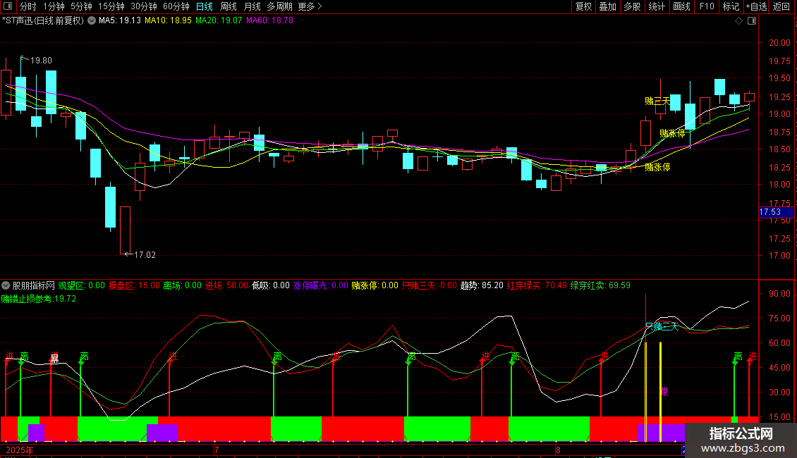主图核心信号:以 “赌字诀” 系列标识(如 “赌涨停”“只赌三天”)提示入场机会,同时结合短期均线(图中多色曲线)辅助判断趋势强弱,信号出现后需结合个股实际走势进一步筛选;