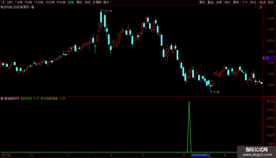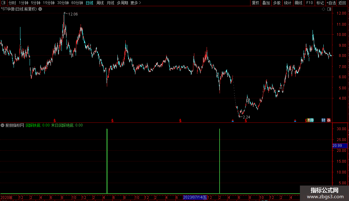 末日回踩绝底:IF(回踩极底 AND 末日绝底,30,0)COLORLIGREEN,LINETHICK2;