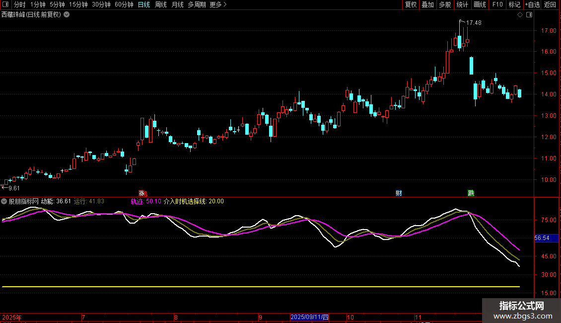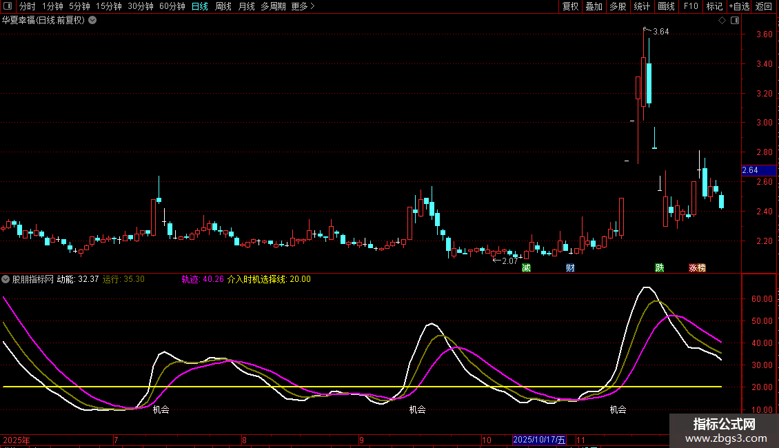 1、动能线(白色)从下方向上(低于23即可),动能值超过23时即为介入时机(具体数值可在源代码中调整,数值越低指标越灵敏,但趋势可靠性会降低。同理,此数值越大指标提示的介入时机越滞后,具体数值根据个人喜好设定);