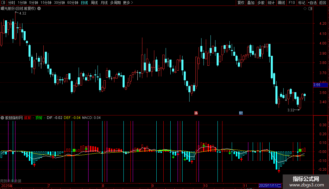 底背离:=REF(CLOSE,A1+1)>CLOSE AND DIFF>REF(DIFF,A1+1) AND CROSS(DIFF,DEA);