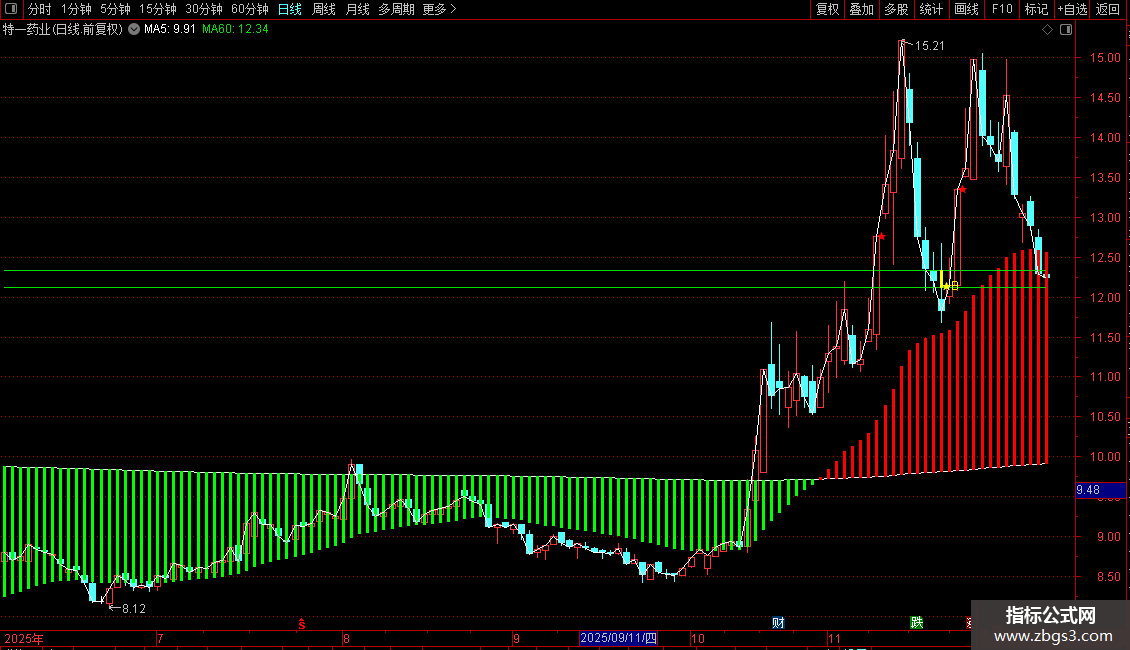 STICKLINE((MA30<强弱),MA30,强弱,1,0),COLOR00FF00;