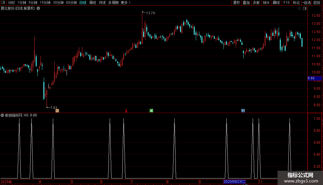 王者波段:=EMA(SMA((CLOSE-LLV(LOW,19))/(HHV(HIGH,19)-LLV(LOW,19))*100,5,1),3);VARG1:=EMA(王者波段,2);VARG2:=EMA(VARG1,2);VARG3:=crOSS(VARG1,VARG2);XG:VARG3&&VARG1>20;
