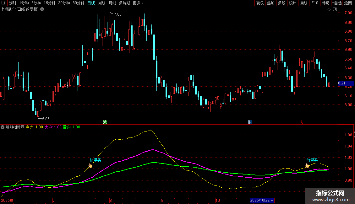 自用指标,不一样的三线定强弱副图,有买点提示,感觉挺精准的!黄线、紫线、绿线从上到下多头排列时关注,出现“放量买”时入手,往往有比较好的收益,甚至可能有惊喜。本指标源码,无未来函数!