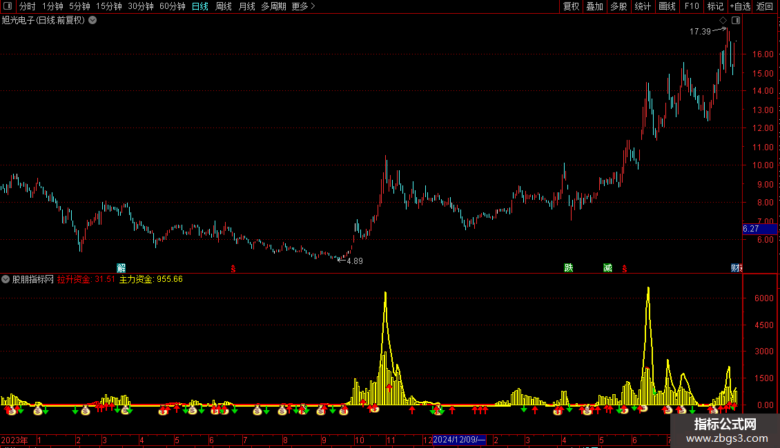 DRAWICON(CROSS(MAZL,ZLGJ) AND MA(C,5)<REF(MA(C,5),1) ,MA(拉升资金,5),2);