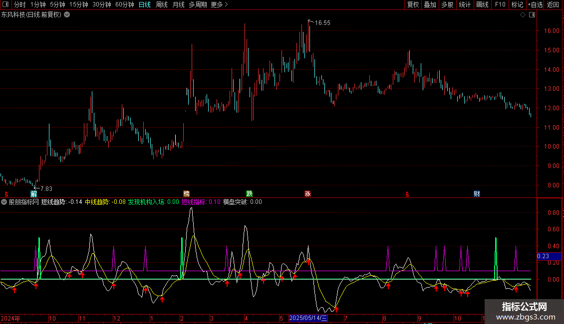 • 买入信号:当“发现机构入场”信号出现(绿色粗线),且短线趋势上穿中线趋势并伴随放量,是较好的介入点。