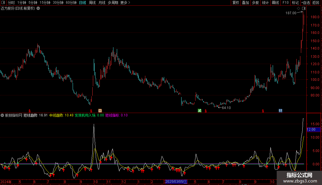 发现机构入场:IF((((((((O <= MA(CLOSE,5)) AND (O <= MA(CLOSE,10))) AND (O <= MA(CLOSE,30))) AND (C >= MA(CLOSE,5))) AND (C >= VARF)) AND ((中线趋势 - REF(中线趋势,1)) > 0)) AND ((短线趋势 - REF(短线趋势,1)) > 0)),0.5,0),LINETHICK2,COLOR66FF00;