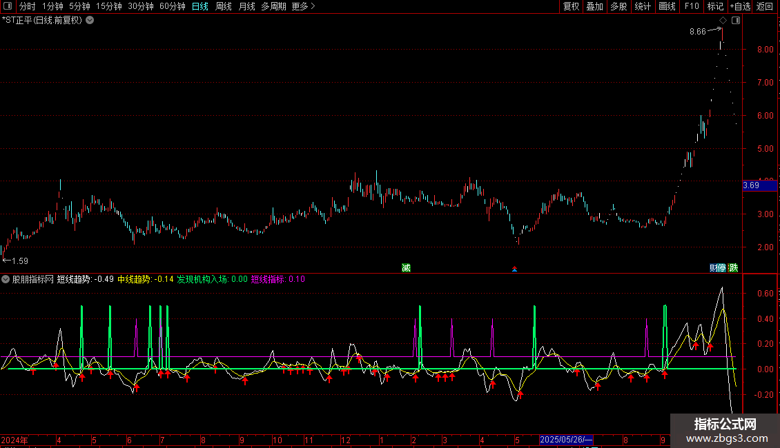 短线指标:IF(((((CROSS(短线趋势,中线趋势) AND (短线趋势 < 0)) AND (中线趋势 < (0 - 0.2)+4)) AND (VAR1 > 45)) AND ((中线趋势 - REF(中线趋势,1)) > 0)),0.4,0.1),COLORMAGENTA;
