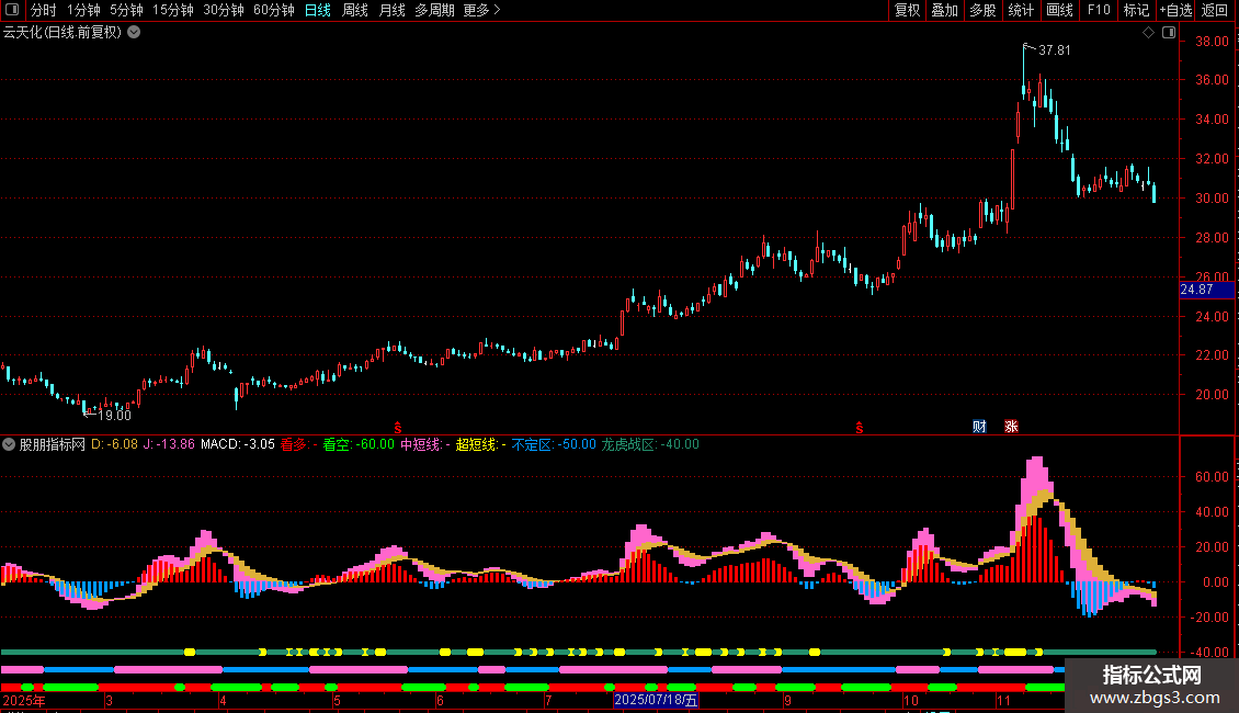 中短线:IF(J>D,-50,DRAWNULL),LINETHICK7,COLORCC66FF;