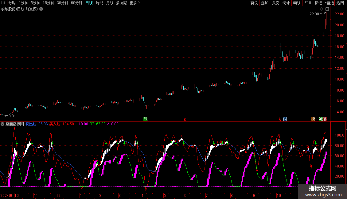 持有:STICKLINE(REF(B7,1)<B7,B7,REF(B7,1),5,0),COLORMAGENTA;