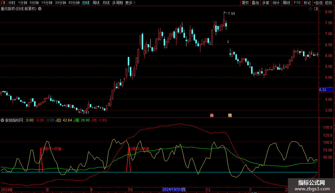 IF(日金叉 AND 周金叉 OR 月金叉,80,0)COLORRED,LINETHICK2;
