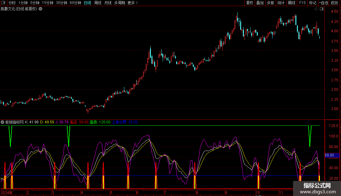 高卖:IF(黄金 AND RSV>VARB2,80,120),COLORGREEN,LINETHICK2;