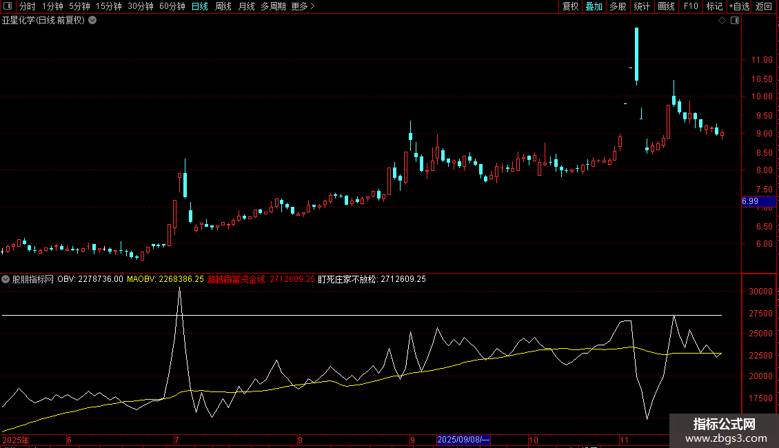 输出 超越赢富资金线:日期日1日前的10日内OBV的最高值,画红色