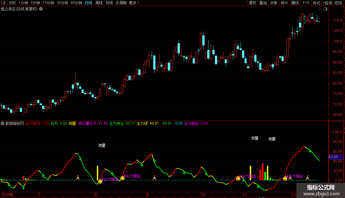 指标通过价格波动、成交量结构与多周期动量,综合判断主力资金是否正在低位吸筹或启动拉升。当股价处于相对低位、出现缩量企稳且主力资金线由负转正并上穿其均线时,系统标记为“主力掘金”信号,提示潜在的启动机会;同时结合地量和超卖状态辅助确认底部区域。操作上可在信号初现时分批布局,配合主力持仓强度和趋势过滤,适合中短线捕捉主力介入初期的个股。