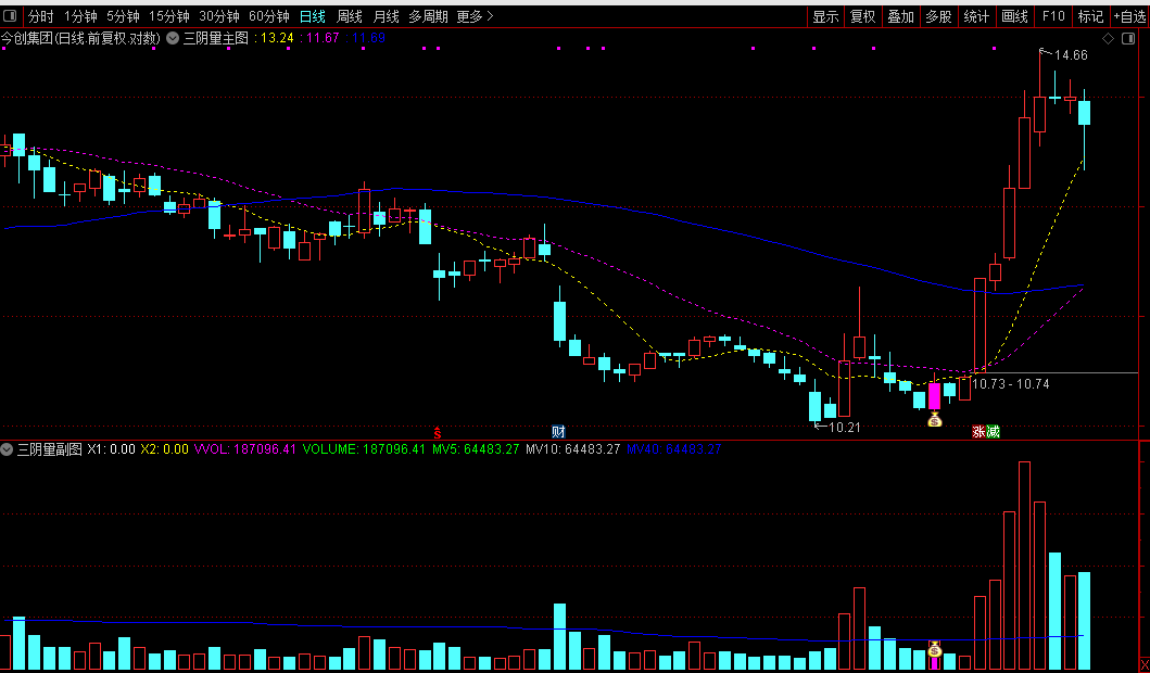 1. 连续出现三根逐级缩量的阴量线,缩量结束后指标会发出“钱袋子”买入信号。